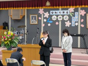 今日の一コマは、第44回入所式です。令和7年度は、3名の新しい利用者を迎えました。2名は入所利用。1名は通所利用です。一昨年に利用を開始した先輩の聖書朗読、自治会会長の歓迎のあいさつ、有志の歓迎の演奏を行いました。新しい利用者3名はしっかりと自己紹介と挨拶を行いました。新生園の桜がお祝いするように満開となりました。