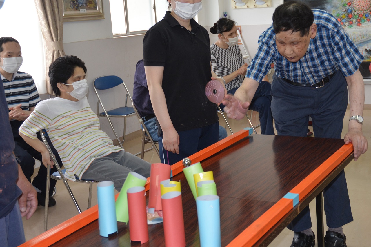神愛園では、64歳以下の利用者で行う光春会で「斬新!エアホッケーで的当てゲーム」を行いました。