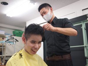 今日の一コマは、コロナ禍、施設内で実施している理髪です。通常は近隣の理髪店に行き、お店の人とコミュニケーションをとり、地域資源を利用して経験を積む機会としています。もうしばらくは施設内での理髪を行います。本日協力いただいた理髪店は、泉塚にあるヘアーサロン多摩の方が来園して理髪を行いました。いつも有難うございます!