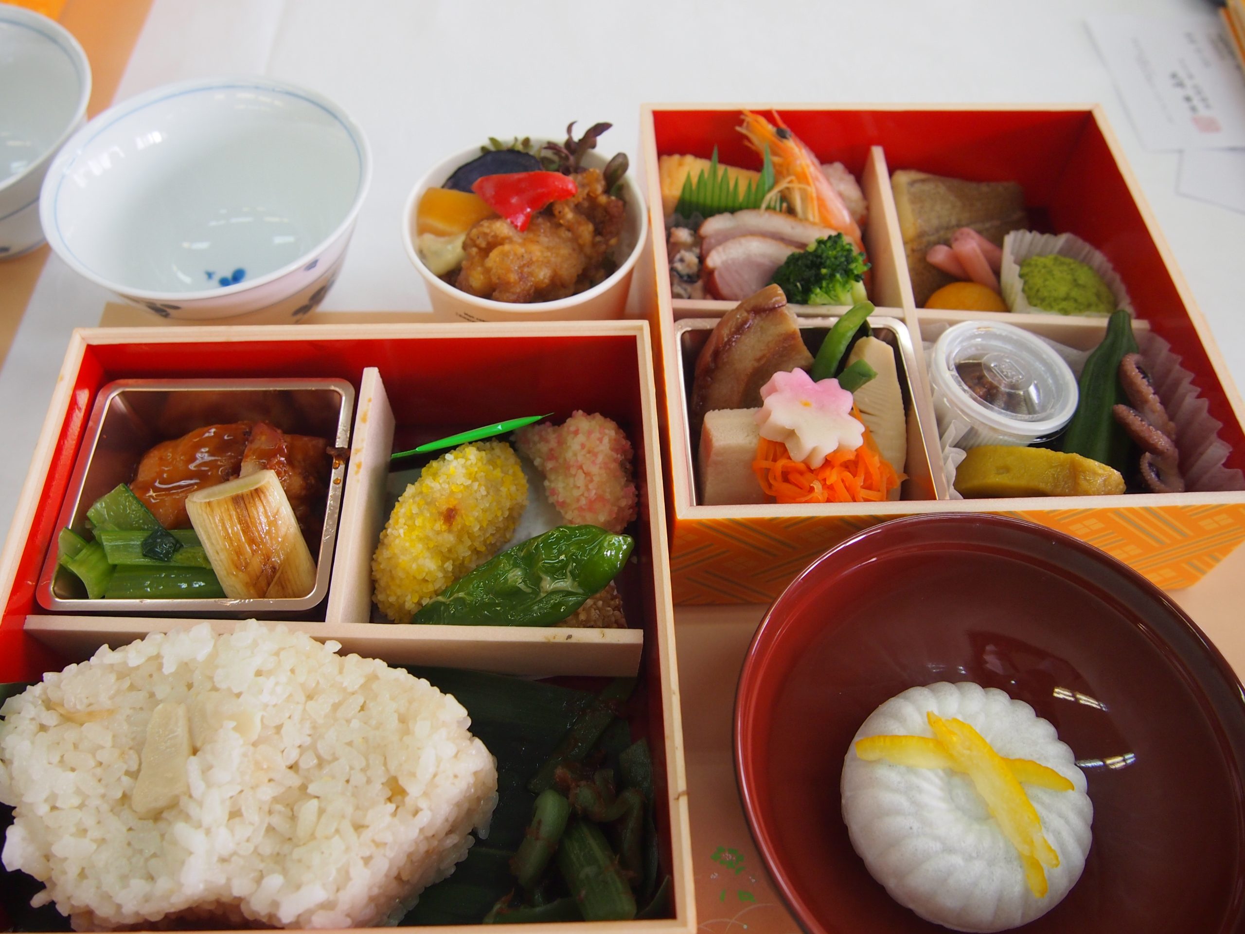 鯛めし&赤だし&かしわ天&ホウレン草お浸し&ずんだ白玉