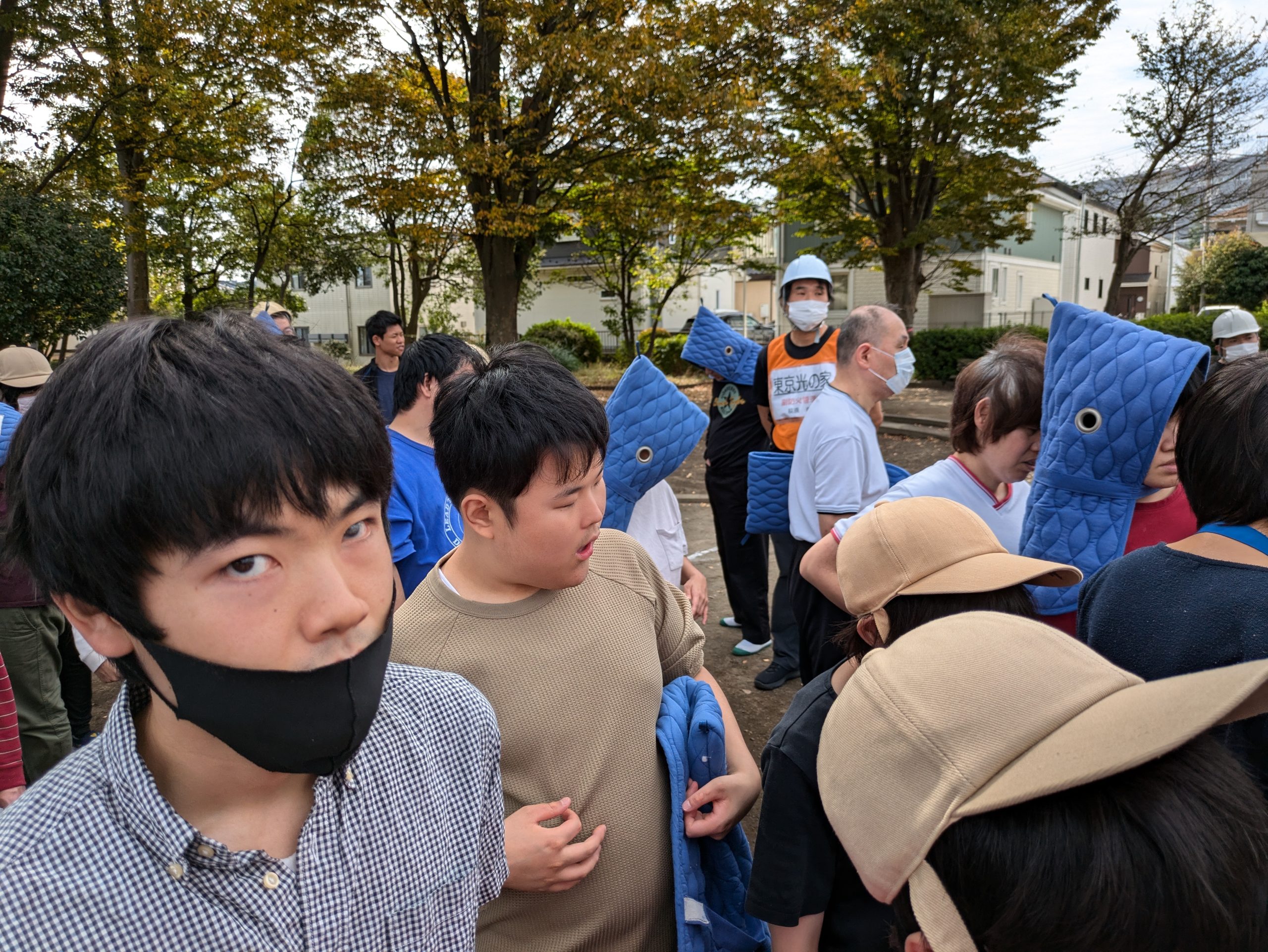 今日の一コマは、地域との合同防災訓練です。年2回、自治会や企業の方と合同で防災訓練を行っています。災害時の共助を日頃の訓練で培って、いざというときの協力体制を作っています。避難誘導の他、車椅子体験やテント設営、段ボールベットの組み立てなどを実施しています。