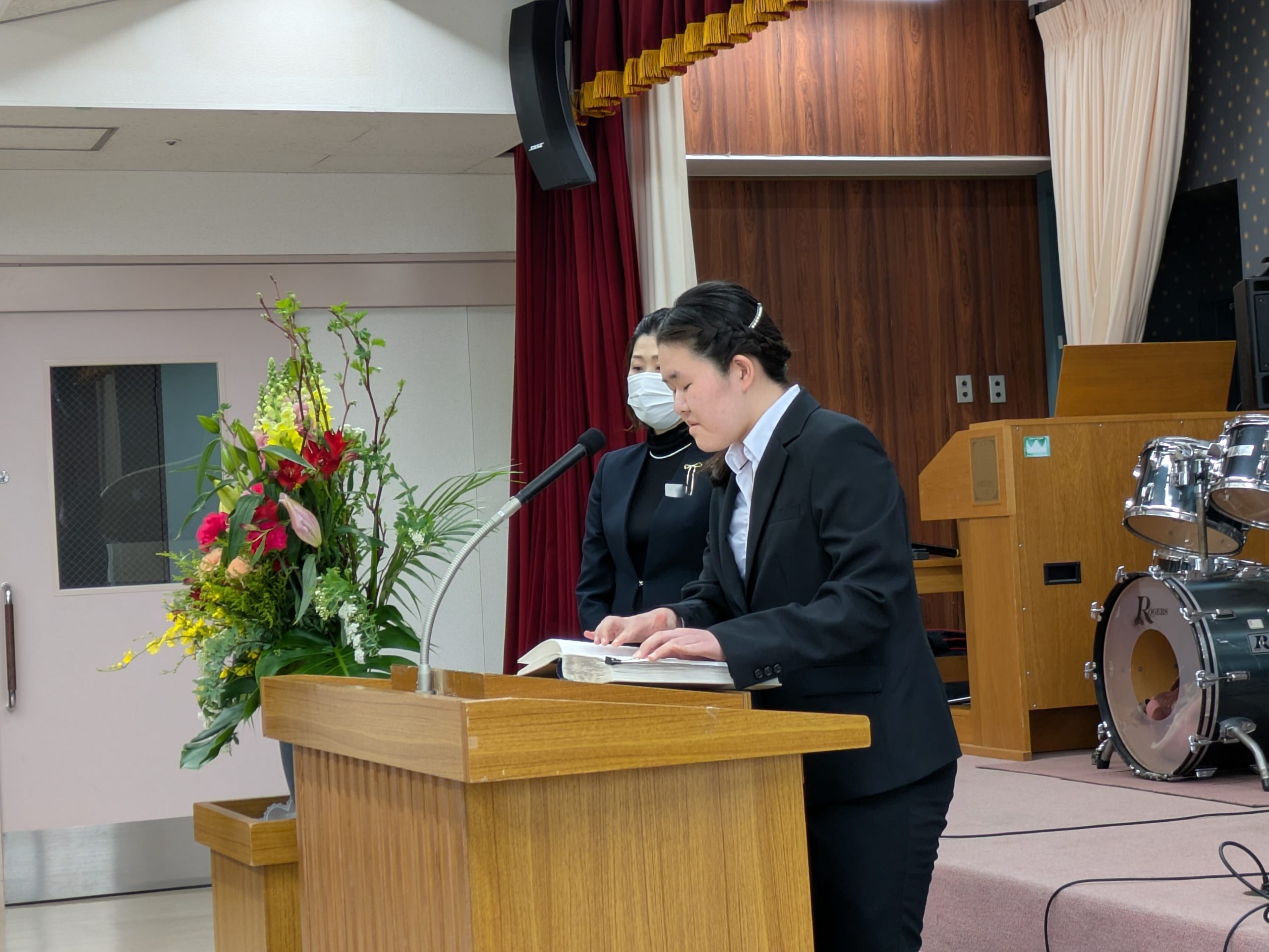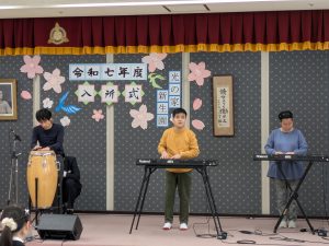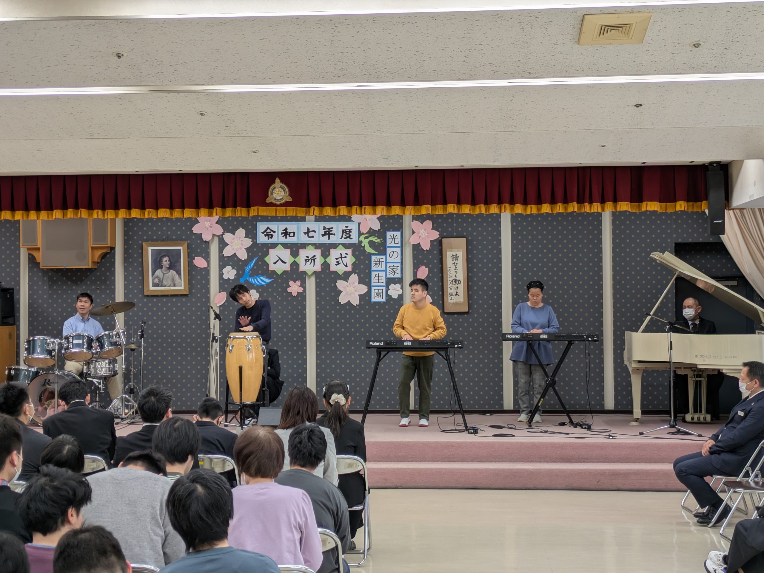 今日の一コマは、第44回入所式です。令和7年度は、3名の新しい利用者を迎えました。2名は入所利用。1名は通所利用です。一昨年に利用を開始した先輩の聖書朗読、自治会会長の歓迎のあいさつ、有志の歓迎の演奏を行いました。新しい利用者3名はしっかりと自己紹介と挨拶を行いました。新生園の桜がお祝いするように満開となりました。