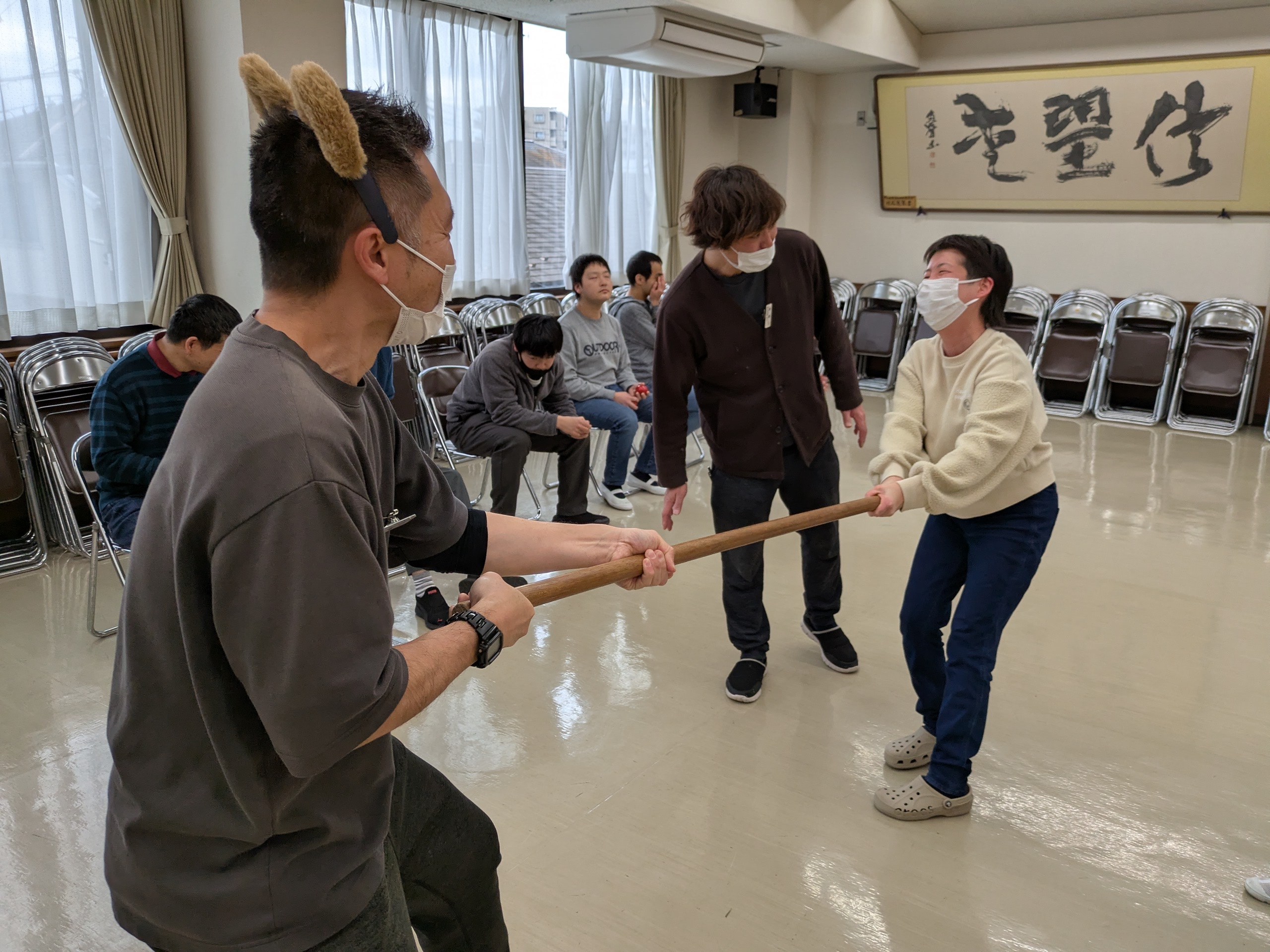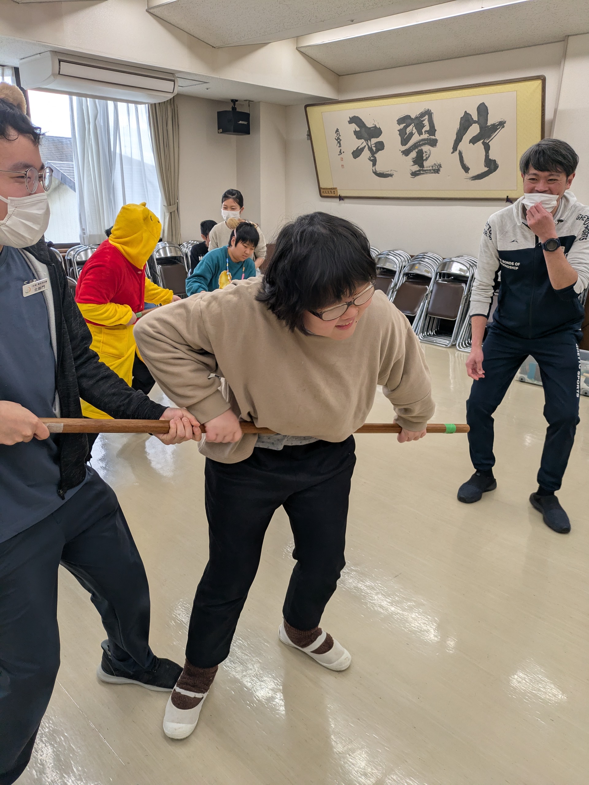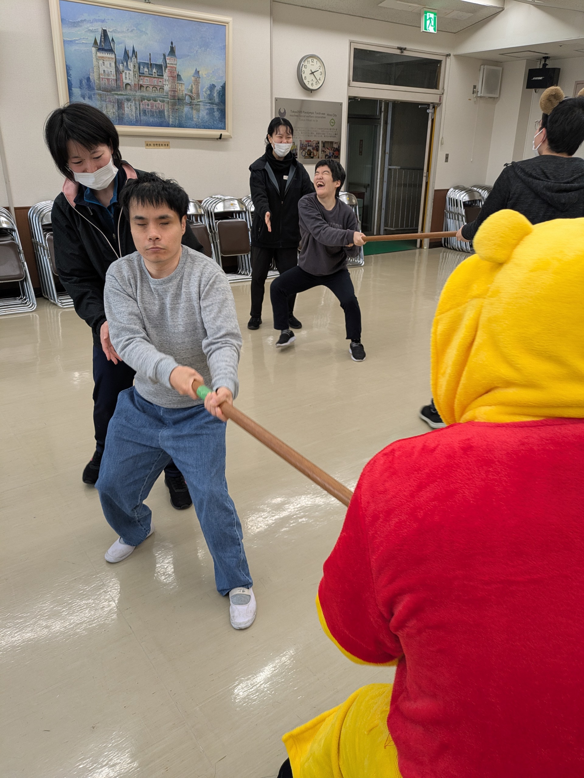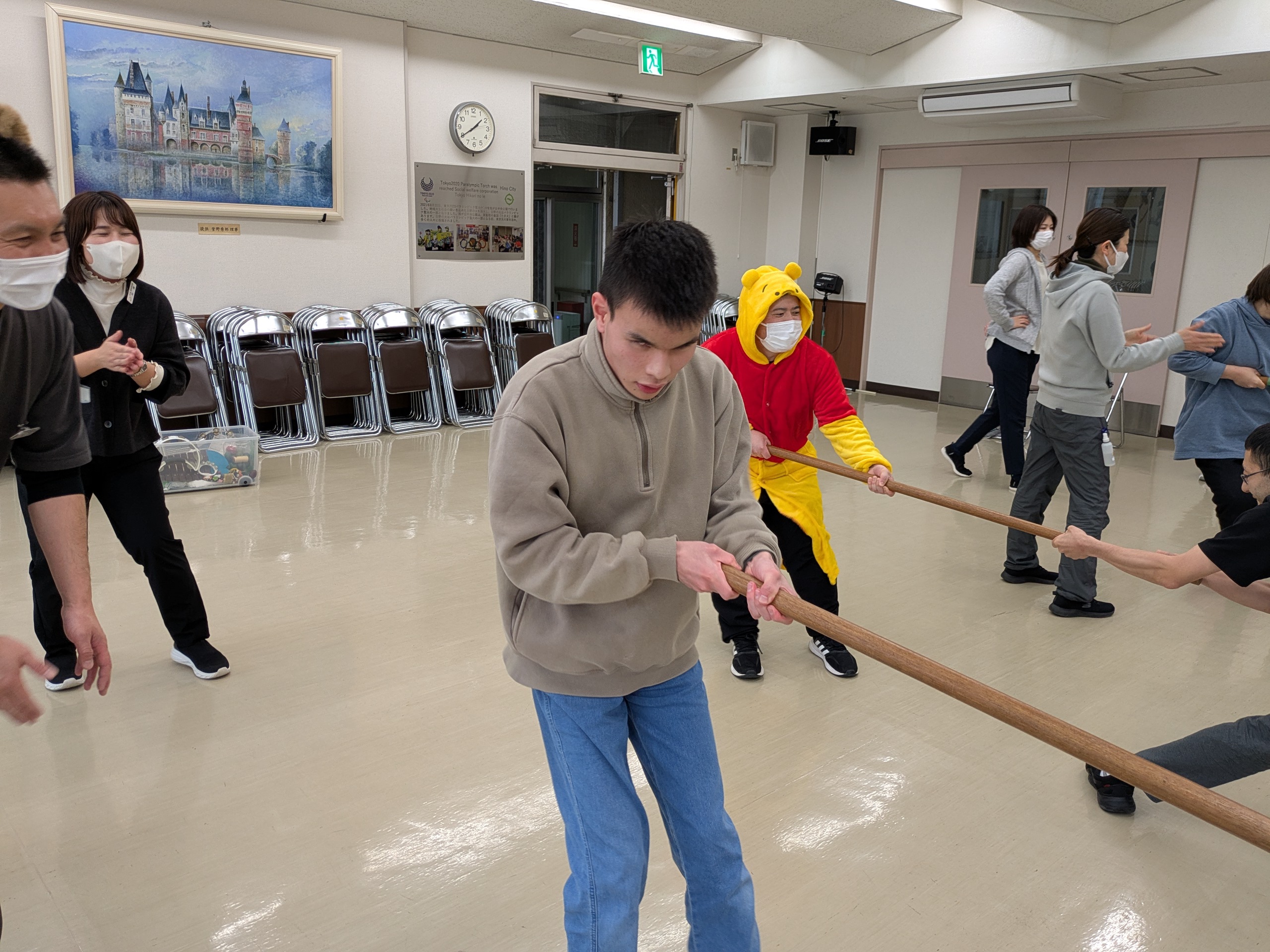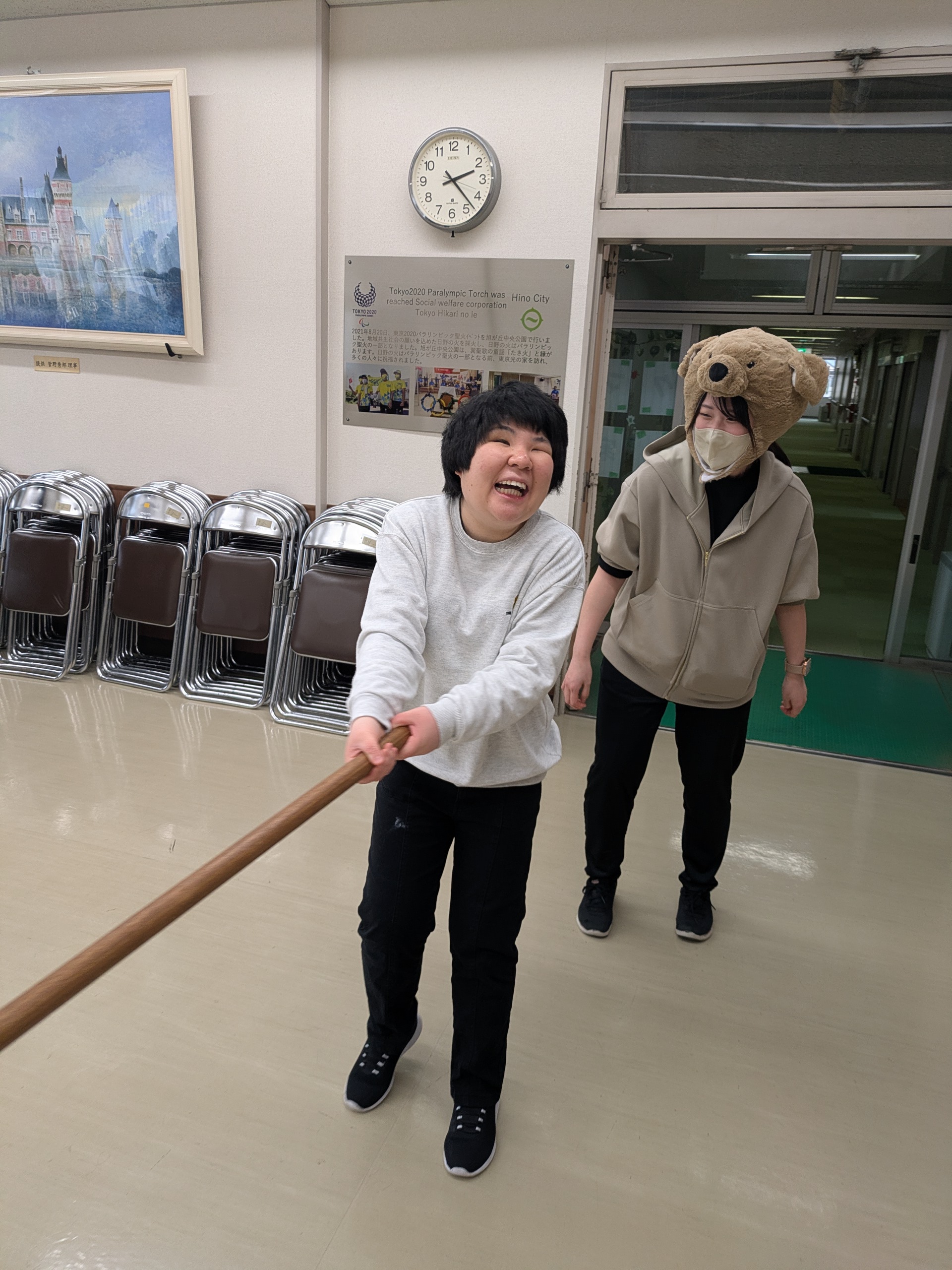 今日の一コマは、レク企画です。毎年、その年の出来事をレクリエーションにして体験する企画。行動訓練係が趣向を凝らして実施しています。今年は①熊(棒引き)②お米(障害物上移動)③万博(体験)にまつわるレクを行い、最後にパン食い競争をして終えました。五感が満足する企画を提供くださり、皆さん笑顔の一日でした。今回は、熊との棒引きを紹介します。