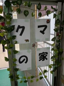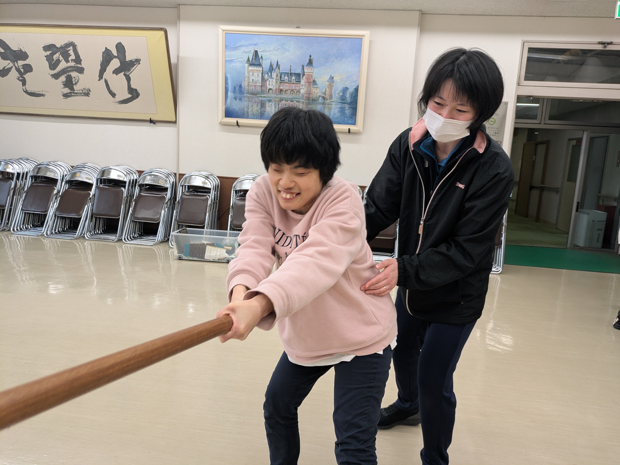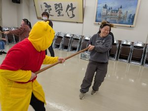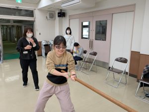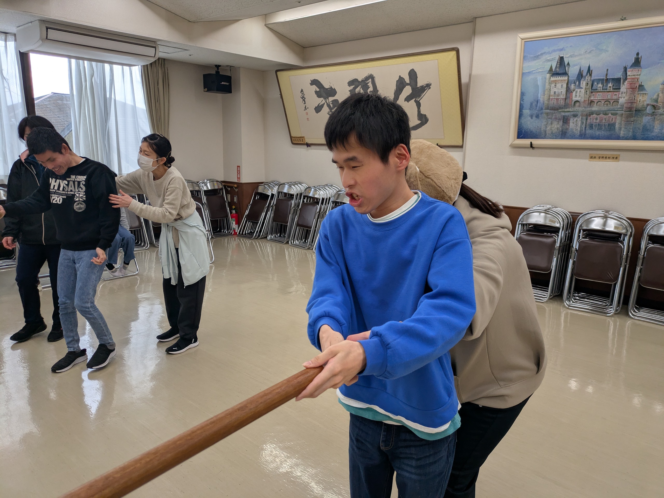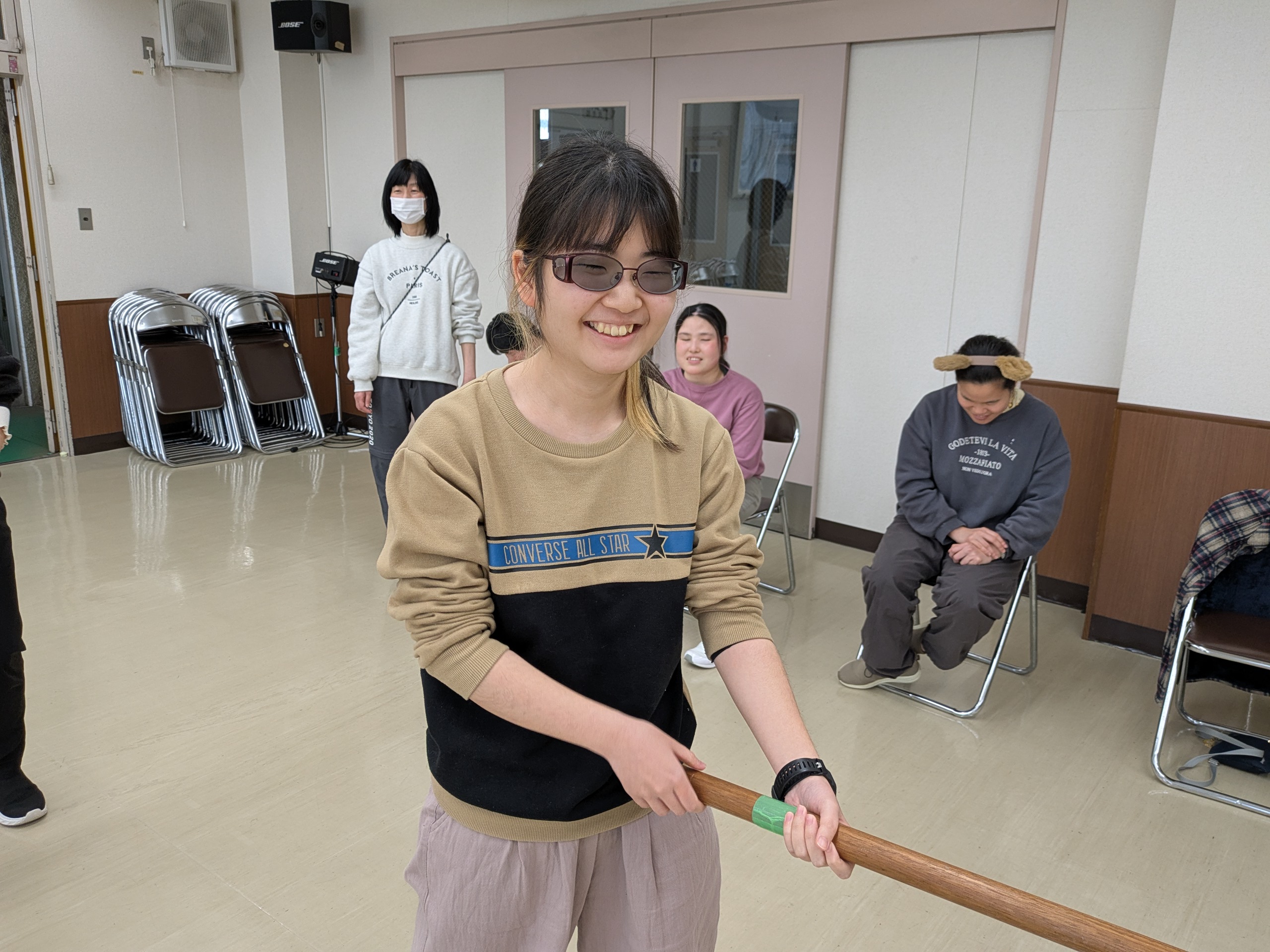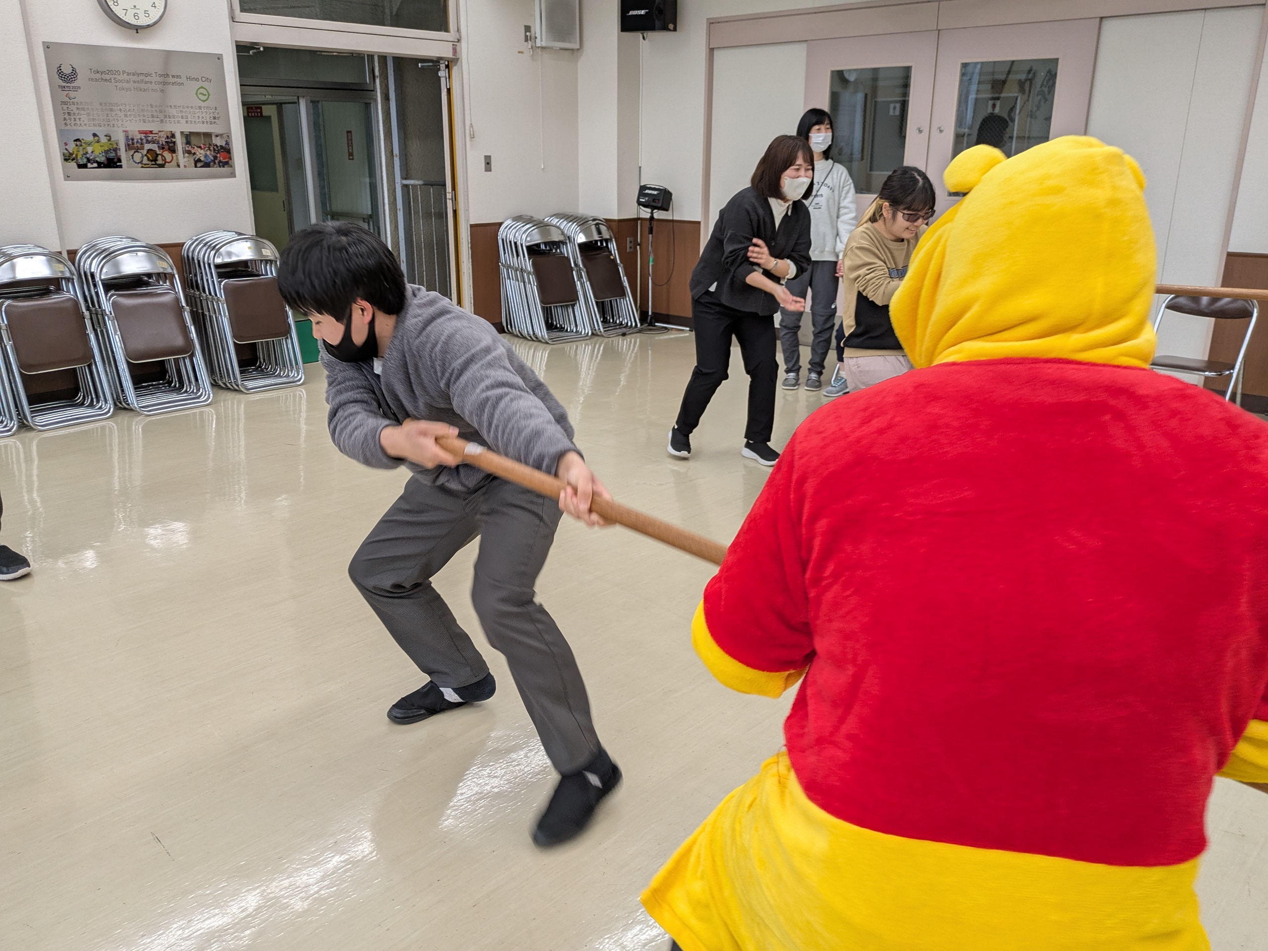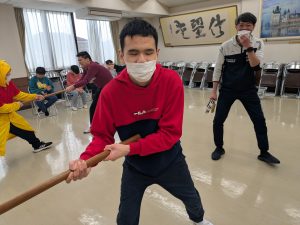 今日の一コマは、レク企画です。毎年、その年の出来事をレクリエーションにして体験する企画。行動訓練係が趣向を凝らして実施しています。今年は①熊(棒引き)②お米(障害物上移動)③万博(体験)にまつわるレクを行い、最後にパン食い競争をして終えました。五感が満足する企画を提供くださり、皆さん笑顔の一日でした。今回は、熊との棒引きを紹介します。