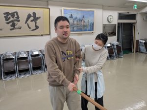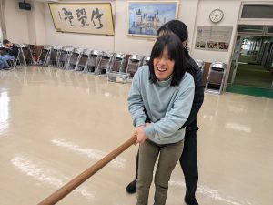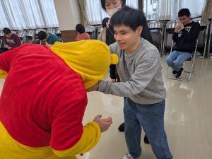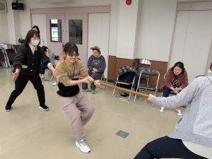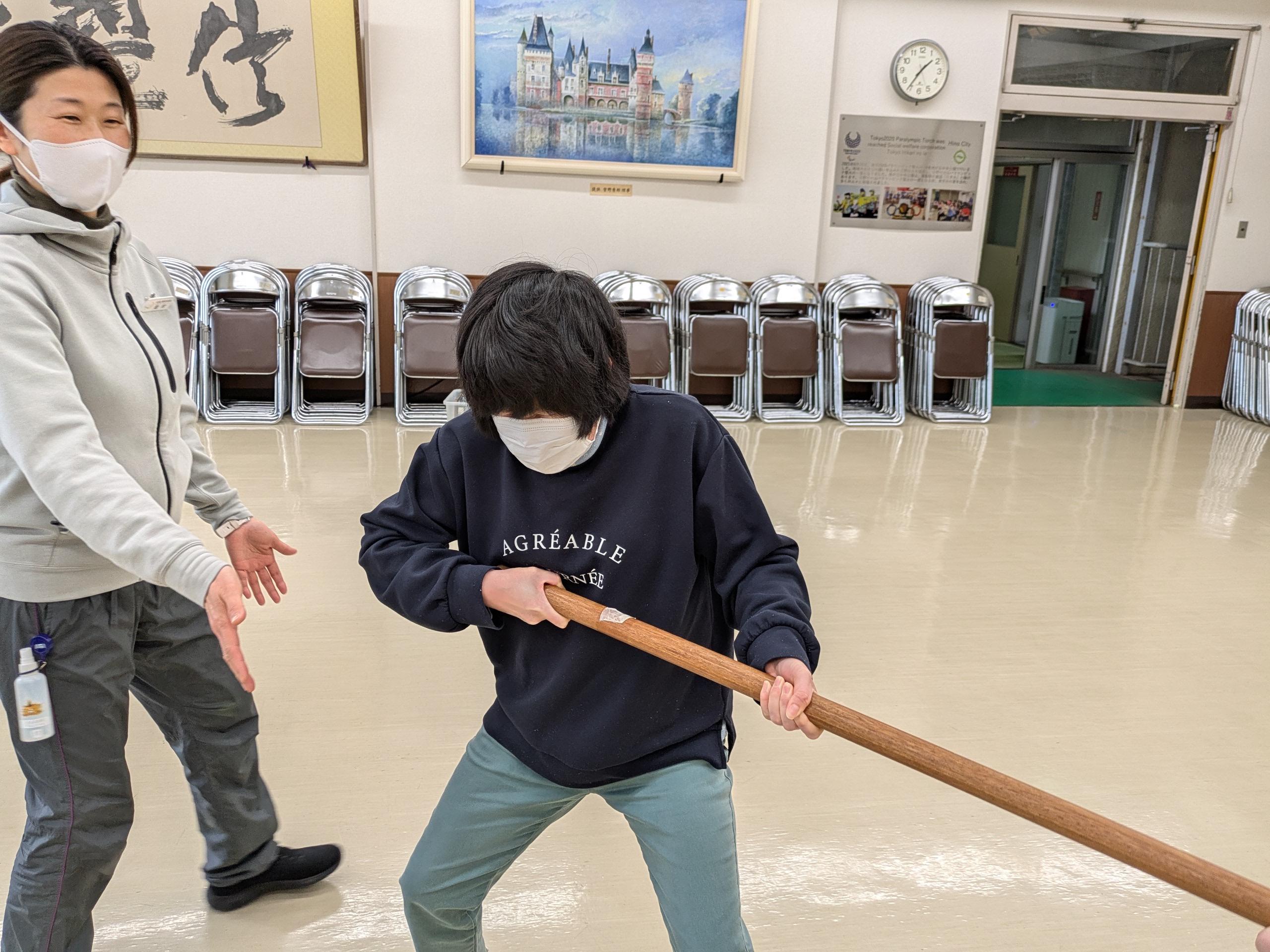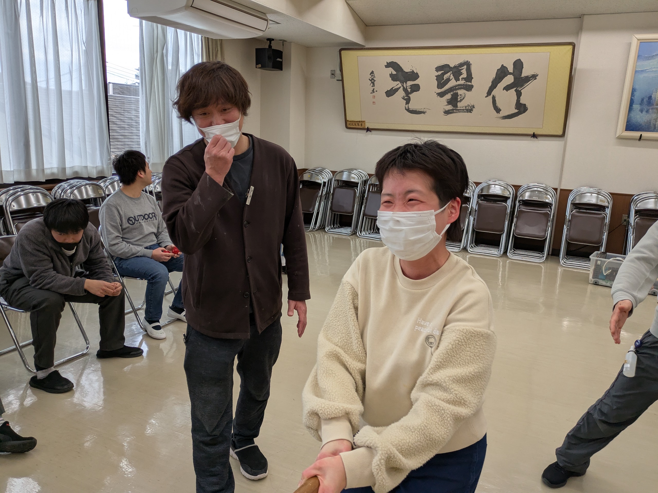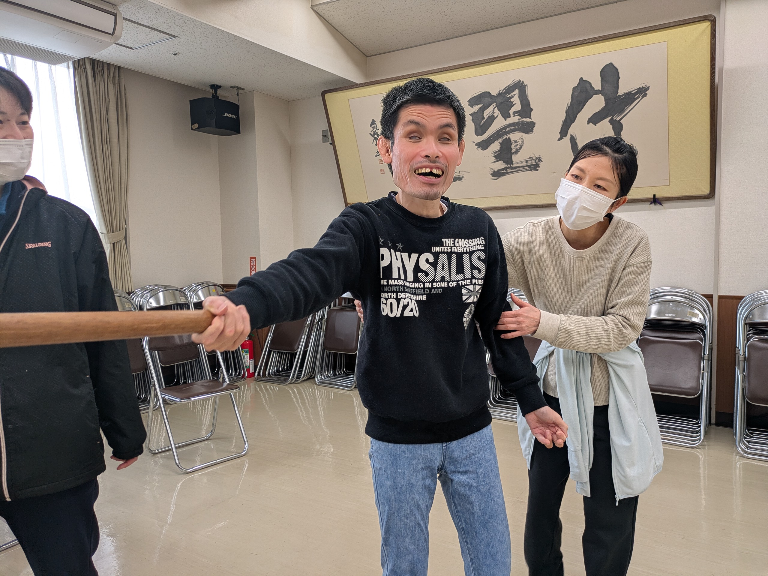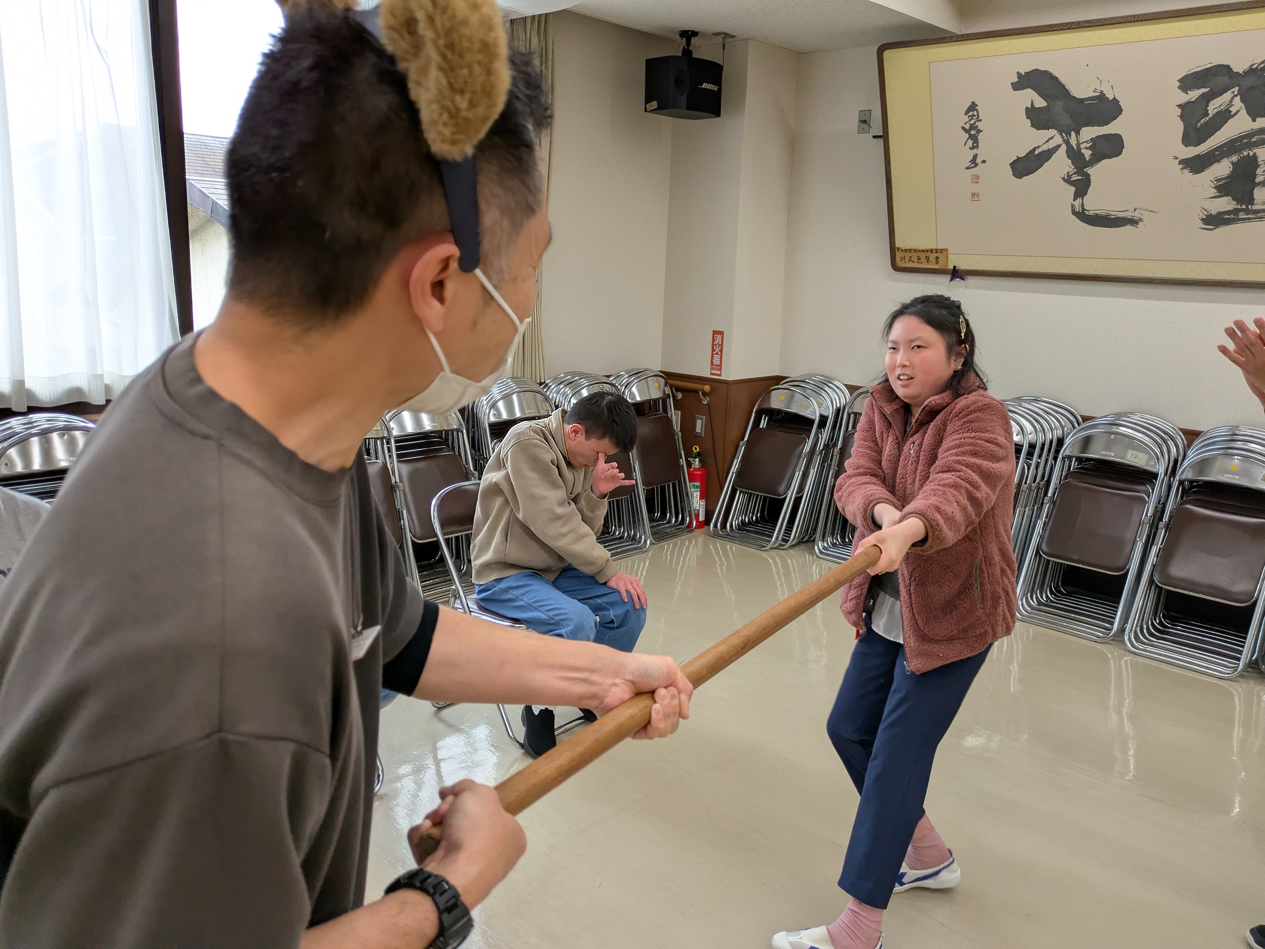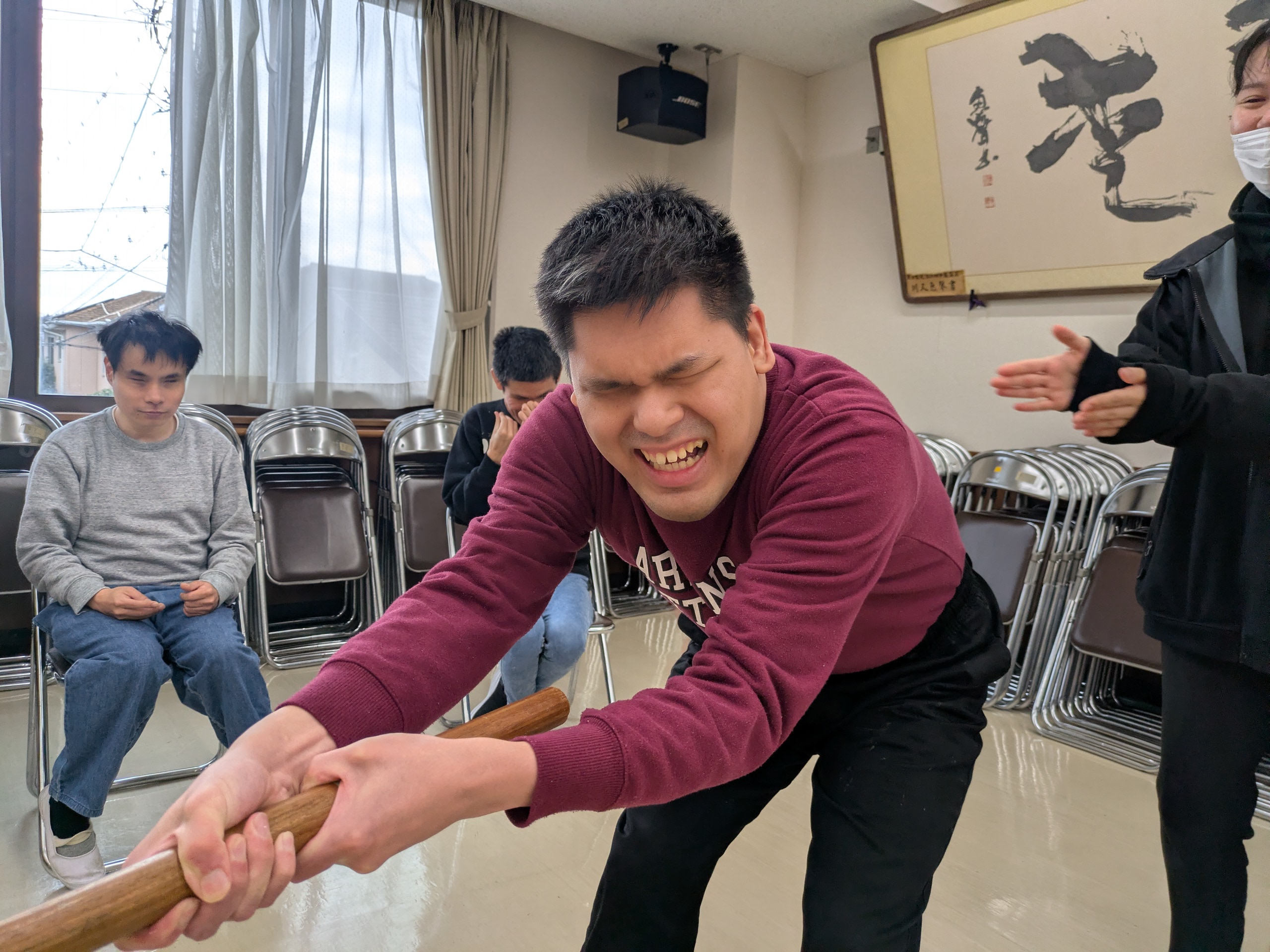 今日の一コマは、レク企画です。毎年、その年の出来事をレクリエーションにして体験する企画。行動訓練係が趣向を凝らして実施しています。今年は①熊(棒引き)②お米(障害物上移動)③万博(体験)にまつわるレクを行い、最後にパン食い競争をして終えました。五感が満足する企画を提供くださり、皆さん笑顔の一日でした。今回は、熊との棒引きを紹介します。