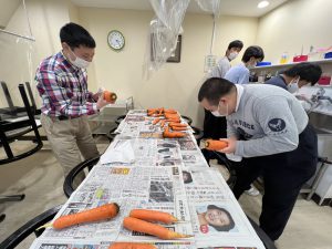 地域の方から「廃棄される予定の人参があるが、人参を掘る体験をしてみますか?」とのお話があり、お会いしました。廃棄と言っても売るには時期を過ぎていますが、まだ食べられるところがある人参でした。全部取っていいということで、みんなで取りに行かせていただきました。ただ力任せに抜こうとすると葉っぱだけが、ブチブチと切れてしまうので、シャベルを使って、とりました。たくさんとれた人参を抱えて就労ホームに持ち帰り、みんなで泥をゴシゴシゴシ・・・。洗うときれいなオレンジ色の人参が!!そして部屋いっぱいに人参の香りがしました。