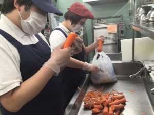 きれいになった人参を、まず食事課へ毎日の食事に使ってもらえるように箱に詰めて買っていただきました。次に残った人参をカナン勤務の利用者で皮をむいて「人参チヂミ」を作りました。「おいしい~~!!」とみんな口々に言い、モリモリ食べました。まだまだたくさん人参があったので次は「洋風にんじんきんぴら」を作って、販売!!「人参きんぴらいかがですか~?」の声にたくさんの方が買ってくれ、すぐに完売!!みんなで大喜び。