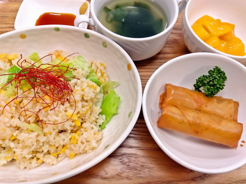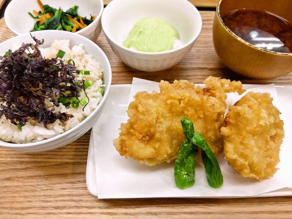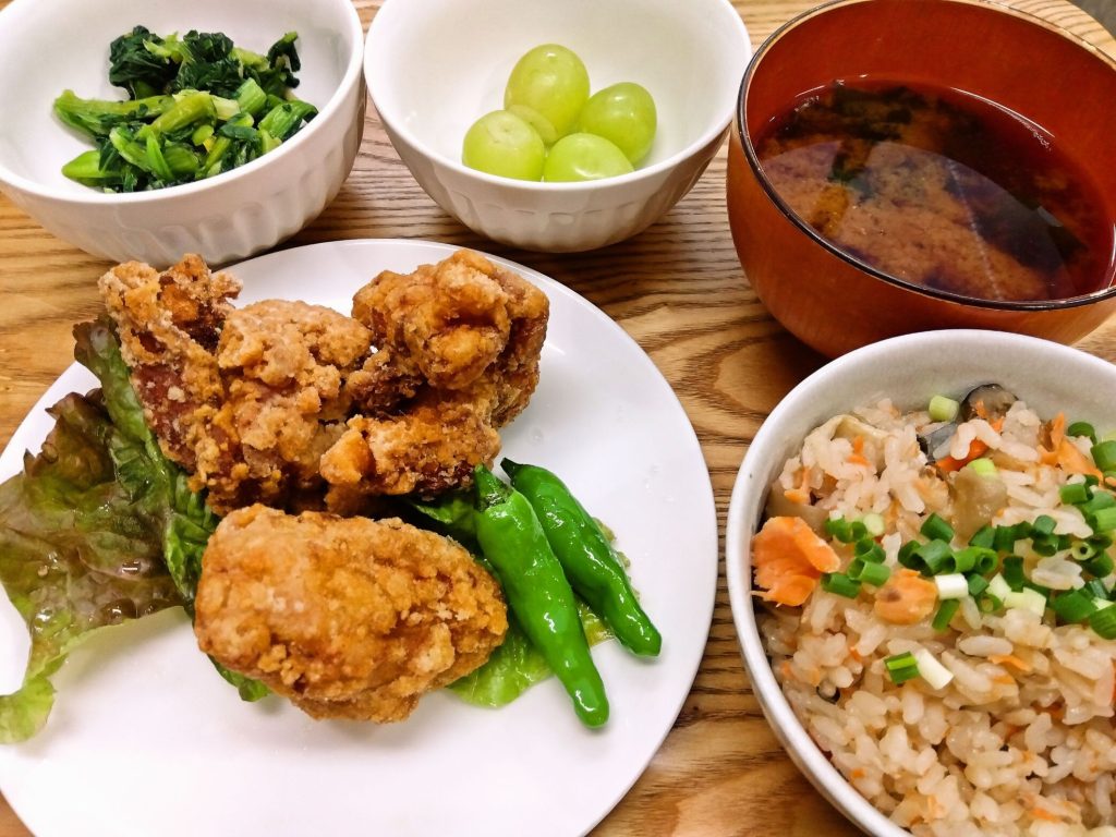 きのこと鮭の炊き込みご飯&赤だし&鶏の唐揚げ&青菜柚子和え