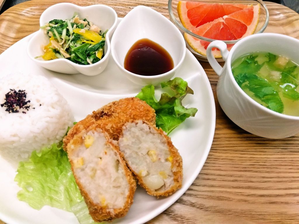 鯛めし&赤だし&かしわ天&ホウレン草お浸し&ずんだ白玉