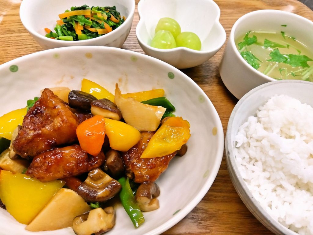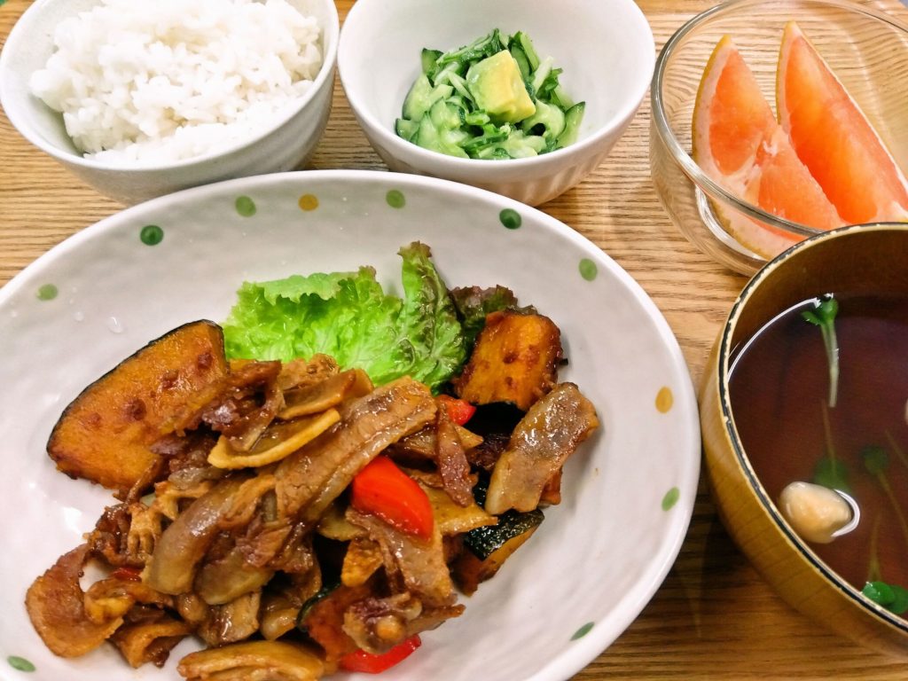 豚肉とかぼちゃのピリ辛炒め&グリーンサラダ&グレープフルーツ
