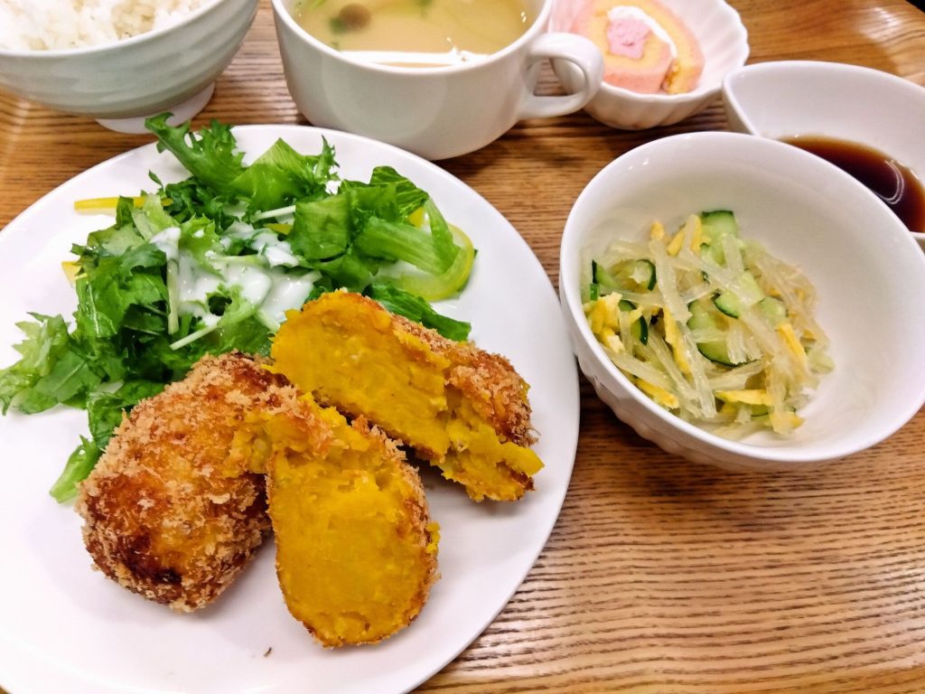 手作り南瓜コロッケ&寒天サラダ&イチゴロールケーキ