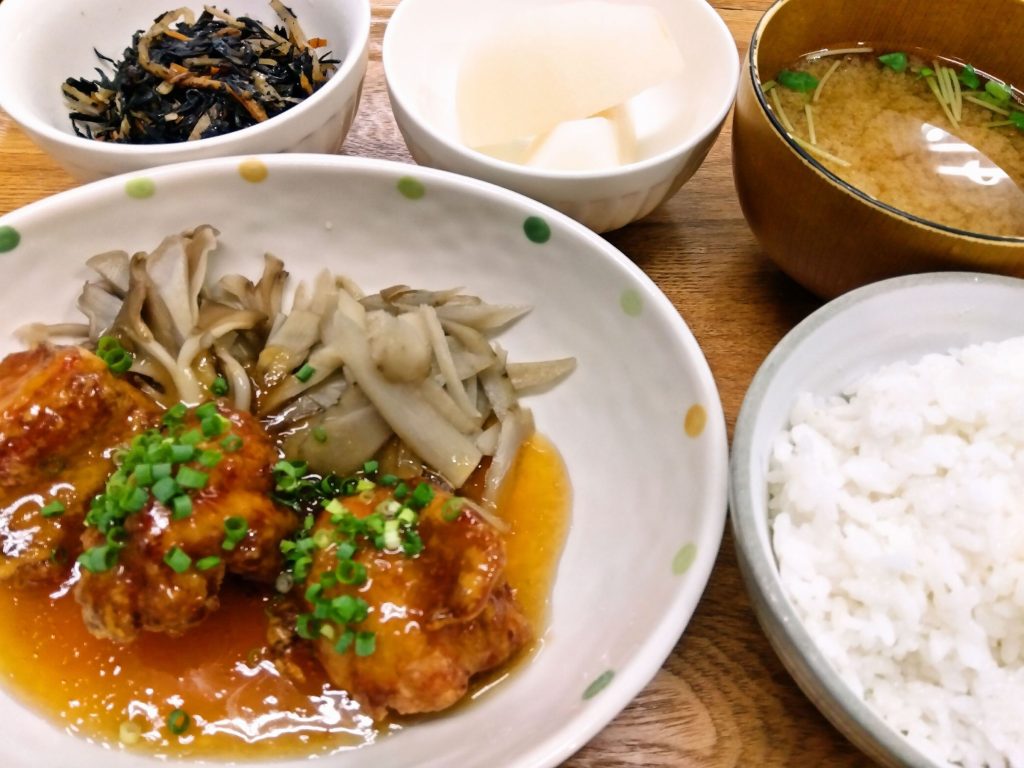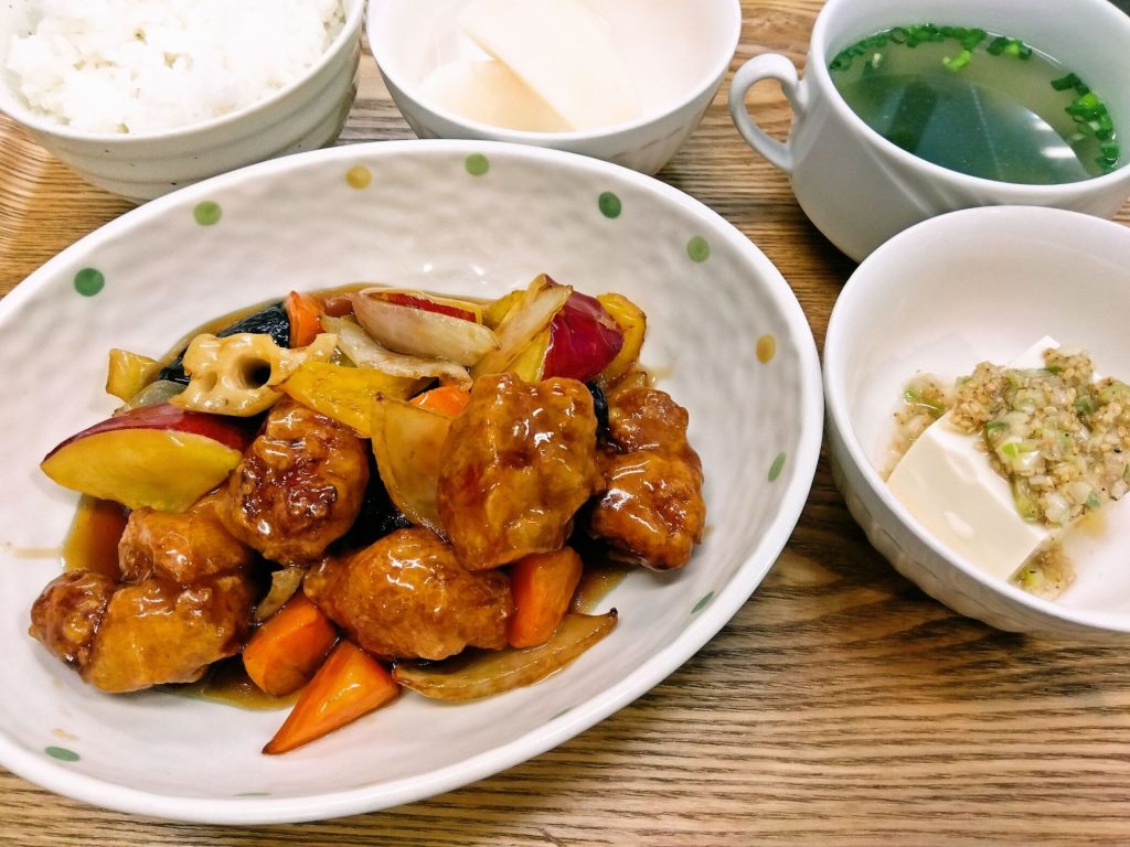秋野菜の黒酢酢豚&ネギ塩冷や奴&梨
