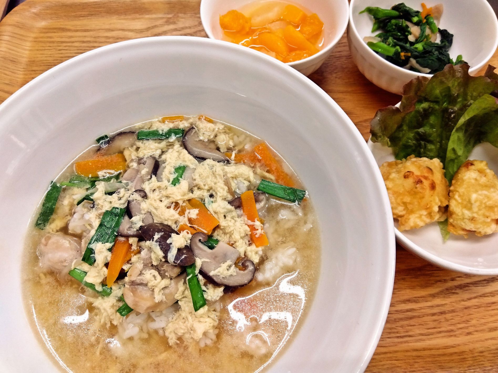 鶏肉と彩り野菜のクッパ&白身魚と豆腐のふんわり天&菜の花のお浸し